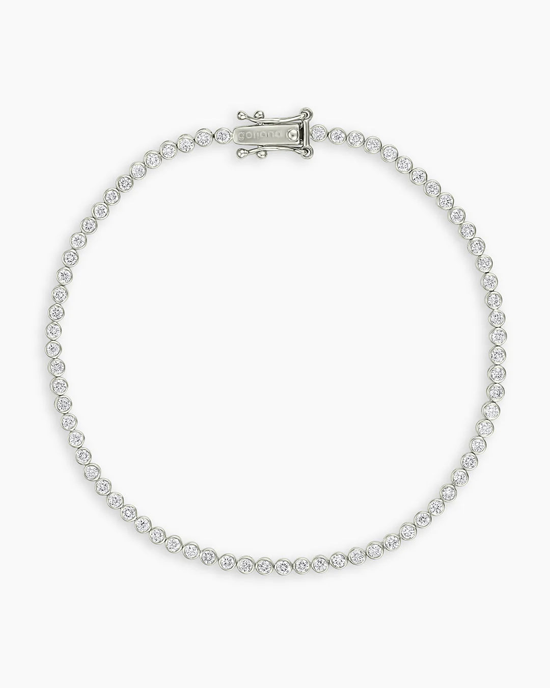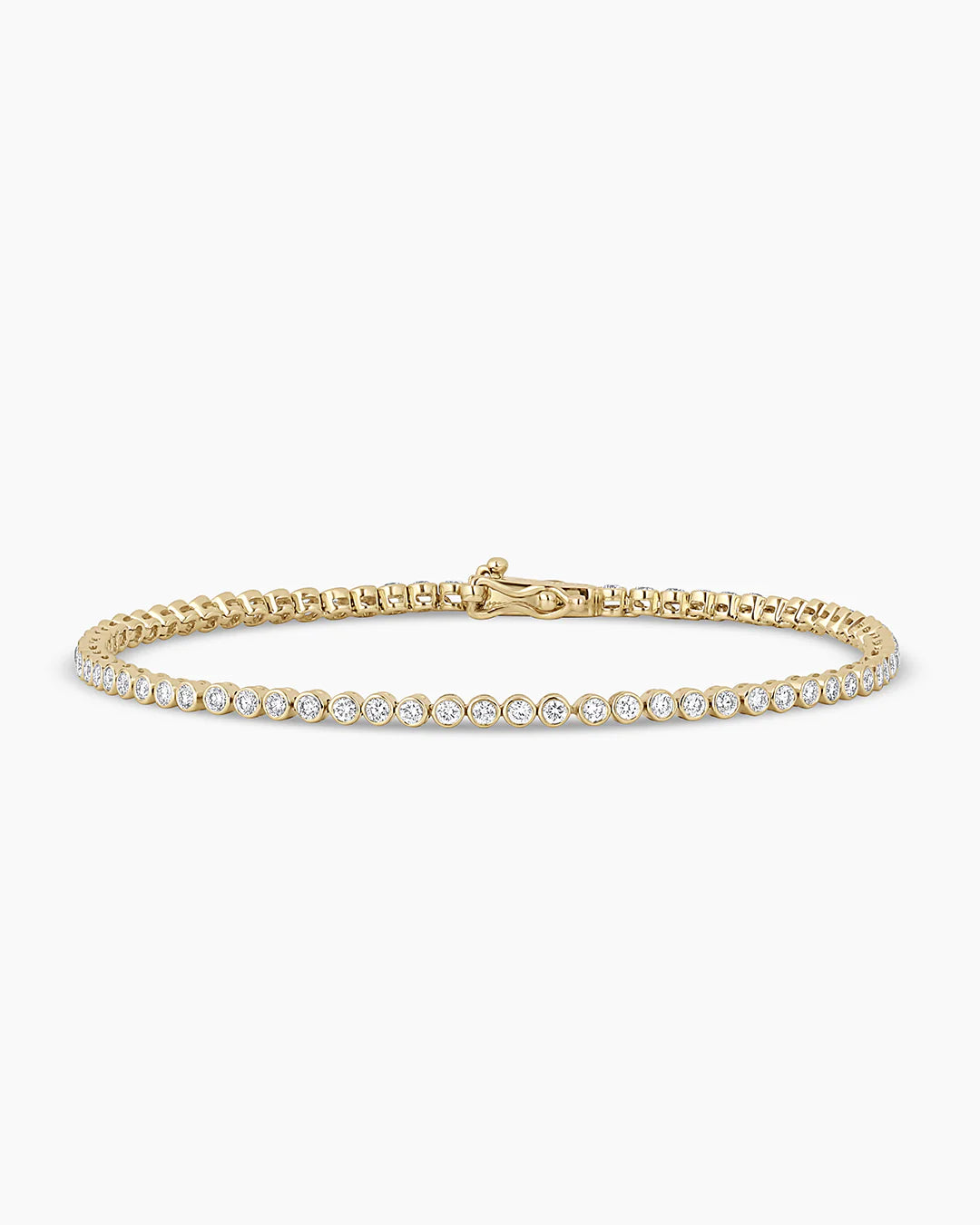 Complete your look with this beautiful, diamond tennis bracelet. Featuring bezel set diamonds and solid gold accents, this is a must-have for your jewelry collection.