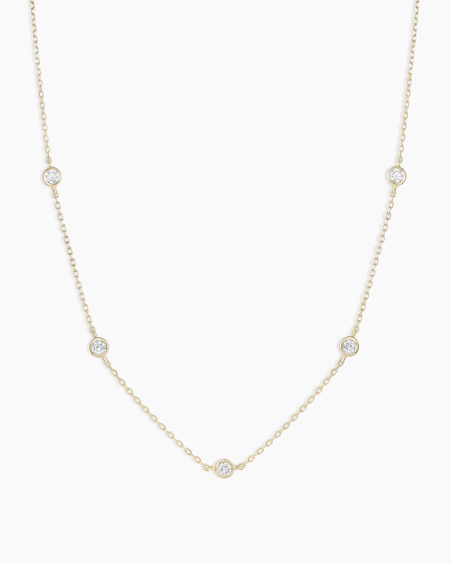 Beautiful and timeless, this classic diamond necklace is made of solid gold and features five bezel-set round cut diamonds. This adjustable necklace is ideal for completing any look. Perfect for special occasions or everyday wear, it's an eye-catching addition to your wardrobe.