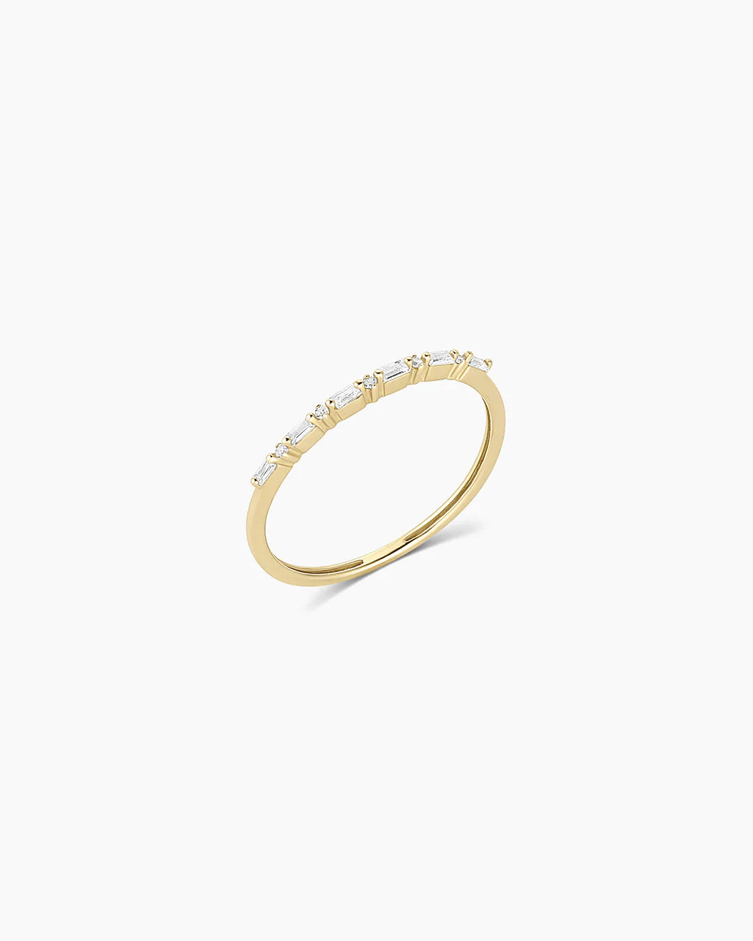 This diamond and white sapphire ring is a jewelry wardrobe staple. Perfect for everyday wear, we like to wear ours stacked alongside other diamond and gold bands.