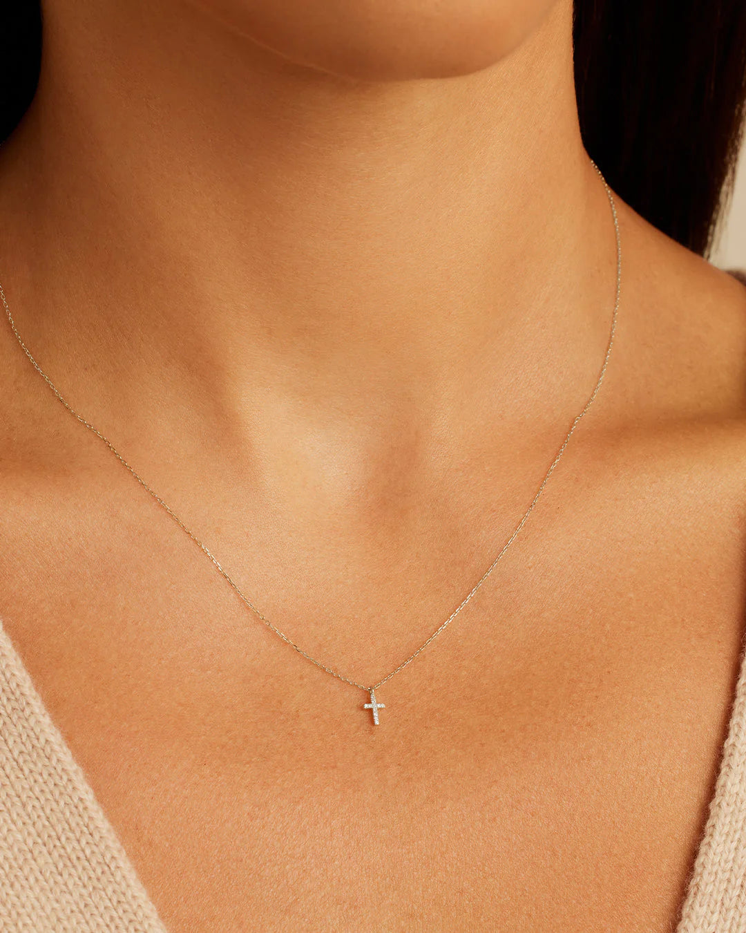 This understated diamond cross necklace can beautifully add to any outfit with its subtle shimmer. To enhance your look, layer your dainty diamond necklace with other chains or add a pop of color with a strand of beautiful gemstones.