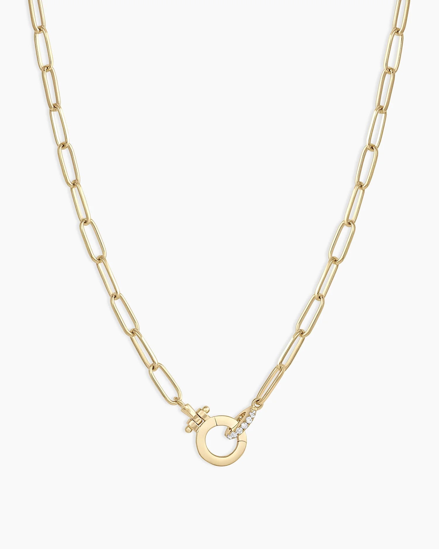Complete your look with this beautiful solid gold link necklace featuring a diamond studded clasp. We love this paired with dainty gold and diamond necklaces for a fully layered look.