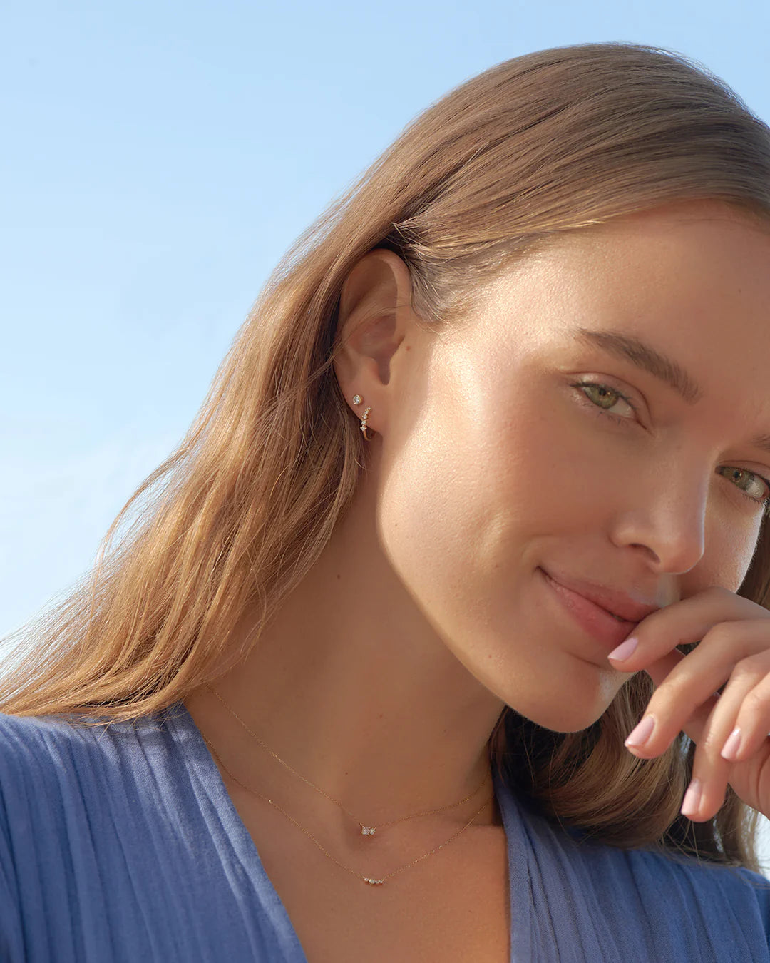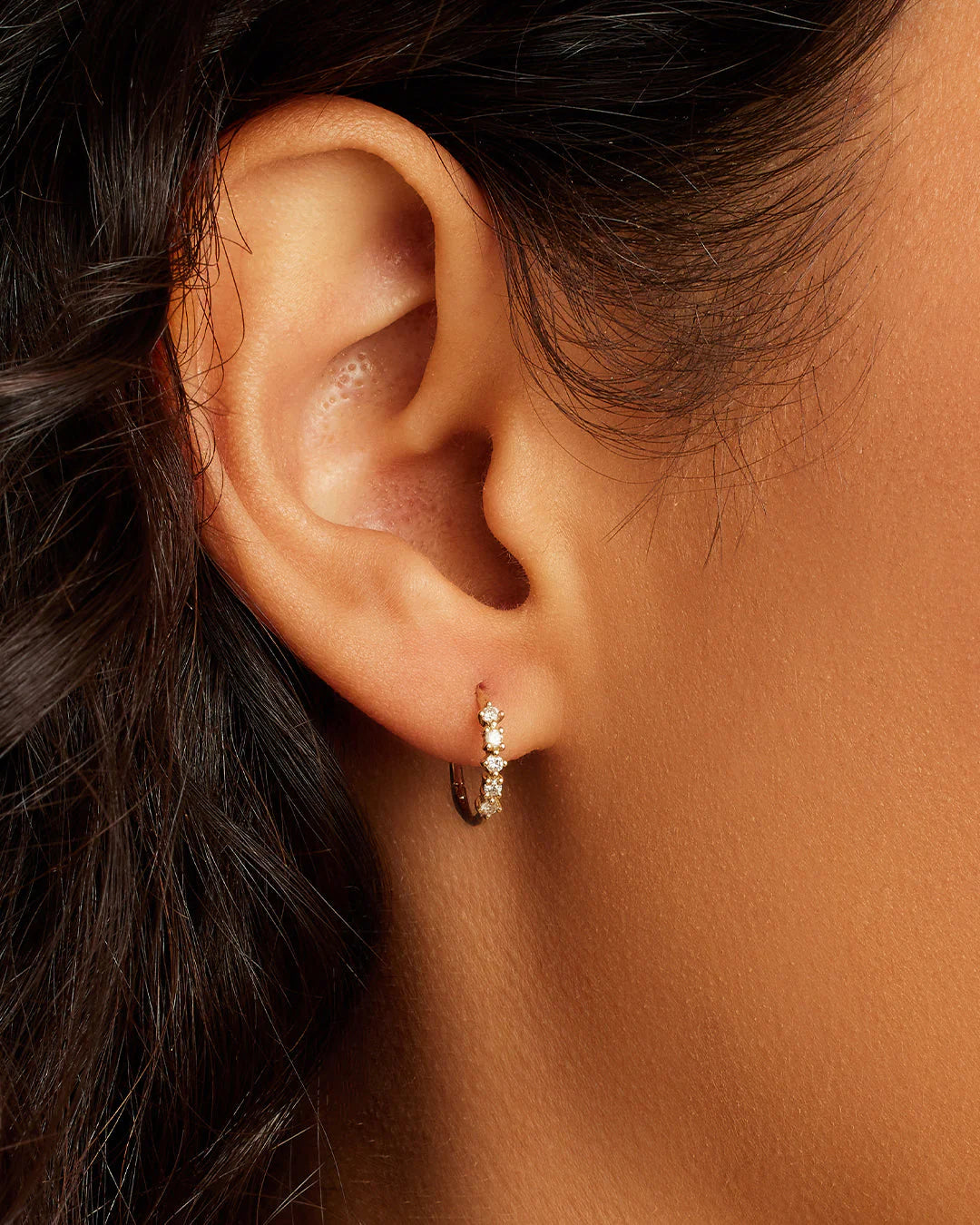 The Diamond Row Huggie is sure to make a statement with its row of dazzling diamonds perfect for first, second, and third piercings. Its classic design will shine all day and night.