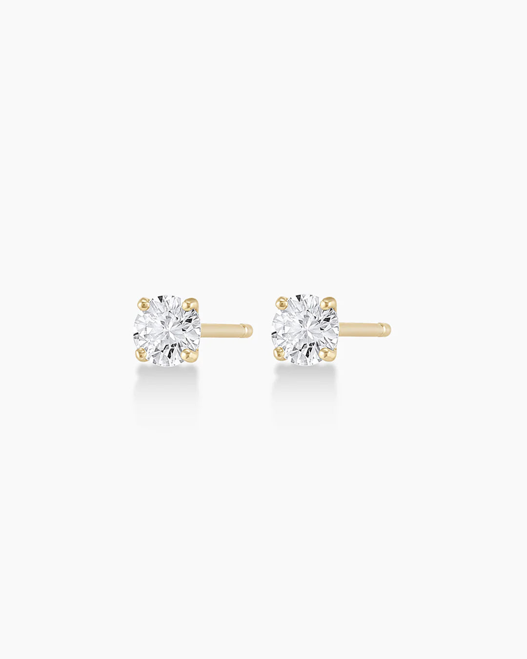 This pair of diamond stud earrings is crafted from solid gold, making them a timeless and luxurious addition to any jewelry collection. Perfect for stacking or to wear alone, these diamond stud earrings provide long-lasting shine. Wear yours stacked with other diamond huggie hoop earrings and studs.