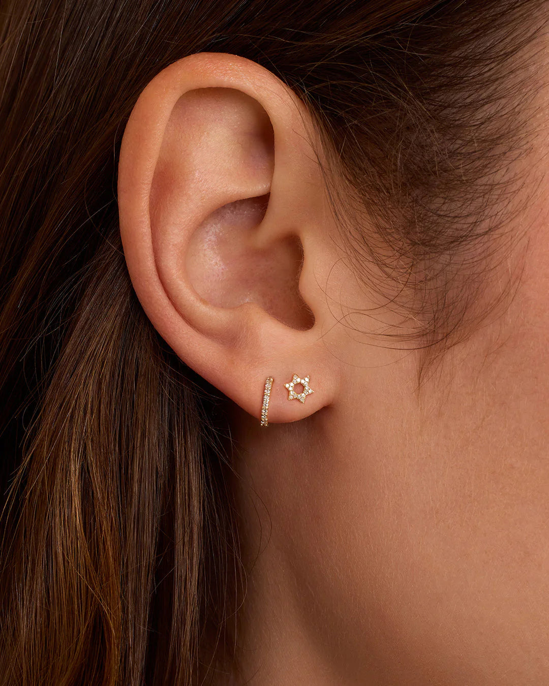 These understated 14k solid gold diamond Star of David stud earrings can beautifully add to any ear stack with their subtle shimmer. To enhance your look, stack your dainty diamond earrings with other diamond and solid gold studs.