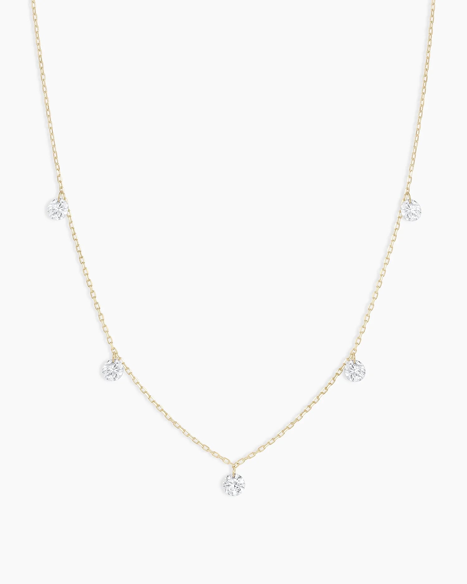 Free from any setting, these diamonds appear to float on your skin and catch the light in the most beautiful way. This diamond necklace features an adjustable gold chain. Wear this floating diamond necklace alone as a solo statement or with the 14k gold Parker Chain Necklace.