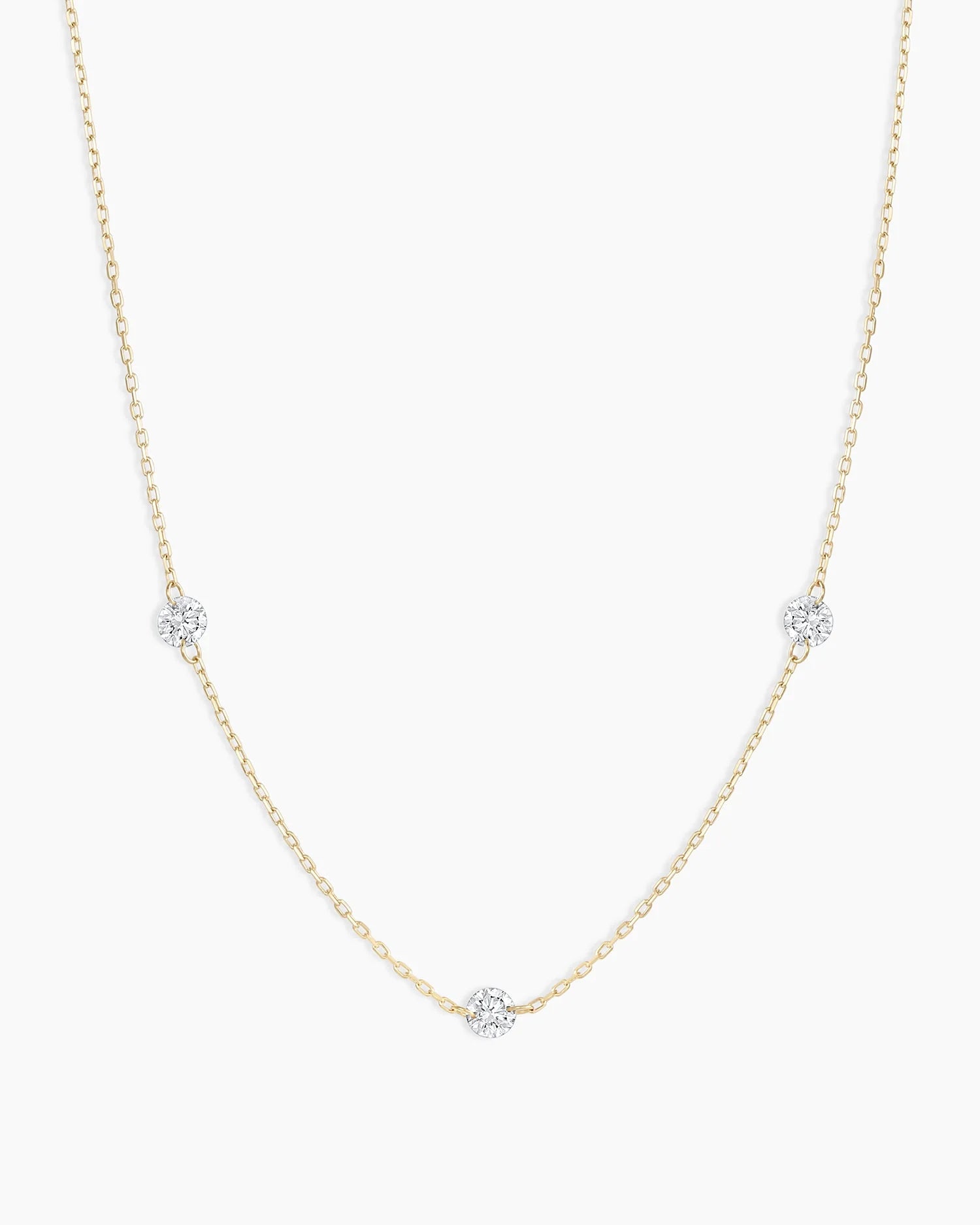 This unique necklace features three diamonds that appear to be floating on a solid gold chain. It catches the light beautifully - but we love it for day and night.