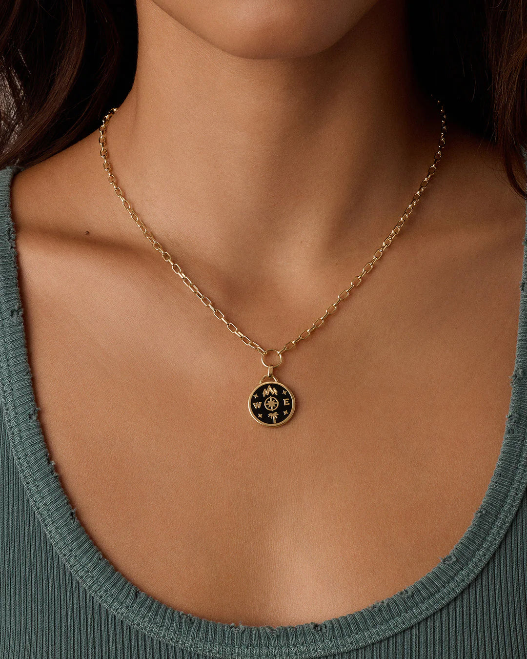 This black enamel and gold plated necklace symbolizes strength, discovery and travel, and features a meaningful compass, palm tree and mountain range. Layer your coin necklace or wear one solo. It's lightweight, eye-catching, and made for every outfit you own.