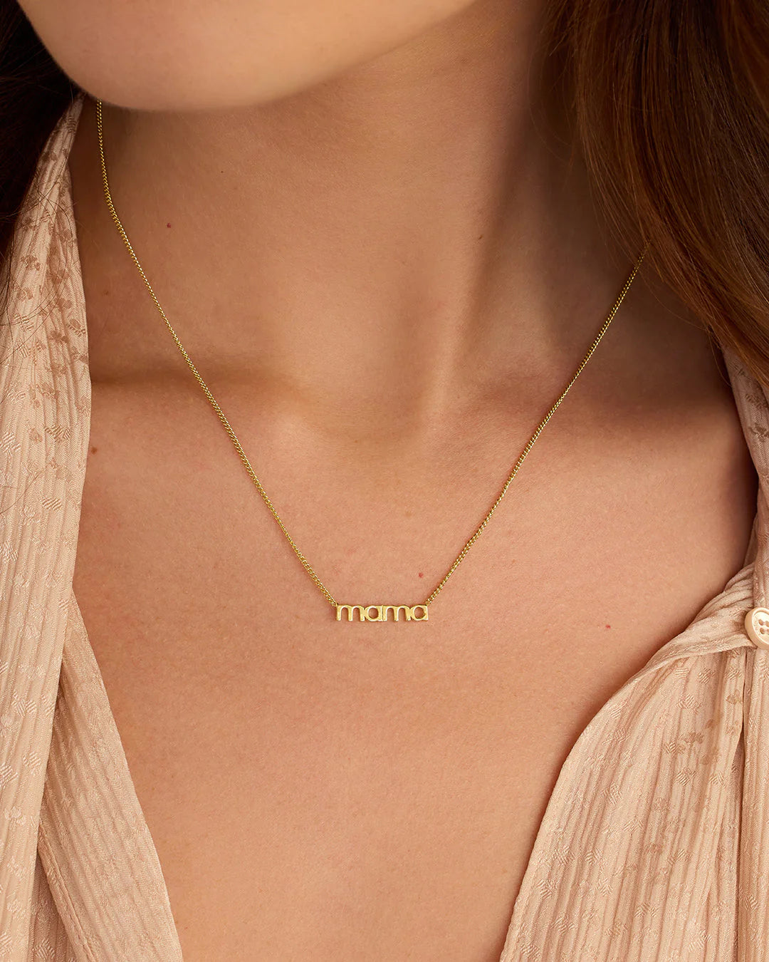 Our 18k gold plated Mama Necklace is the perfect gift for any mom in your life. Featuring a fun font and dainty curb chain, this nameplate necklace is the perfect way to show your love and appreciation.