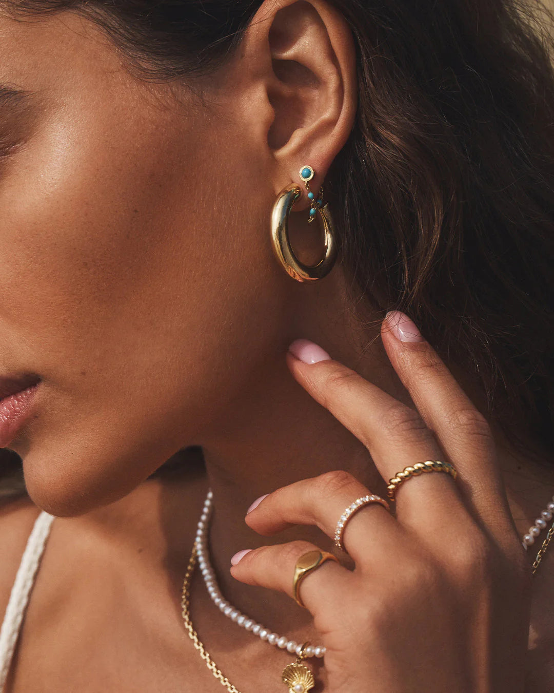 Inspired by a coastal getaway, these 18k gold plated chain huggie earrings are meant to flow from laid-back beach days to chic dinner moments. Tiny touches of turquoise add just the right amount of color - these are perfect for the season.